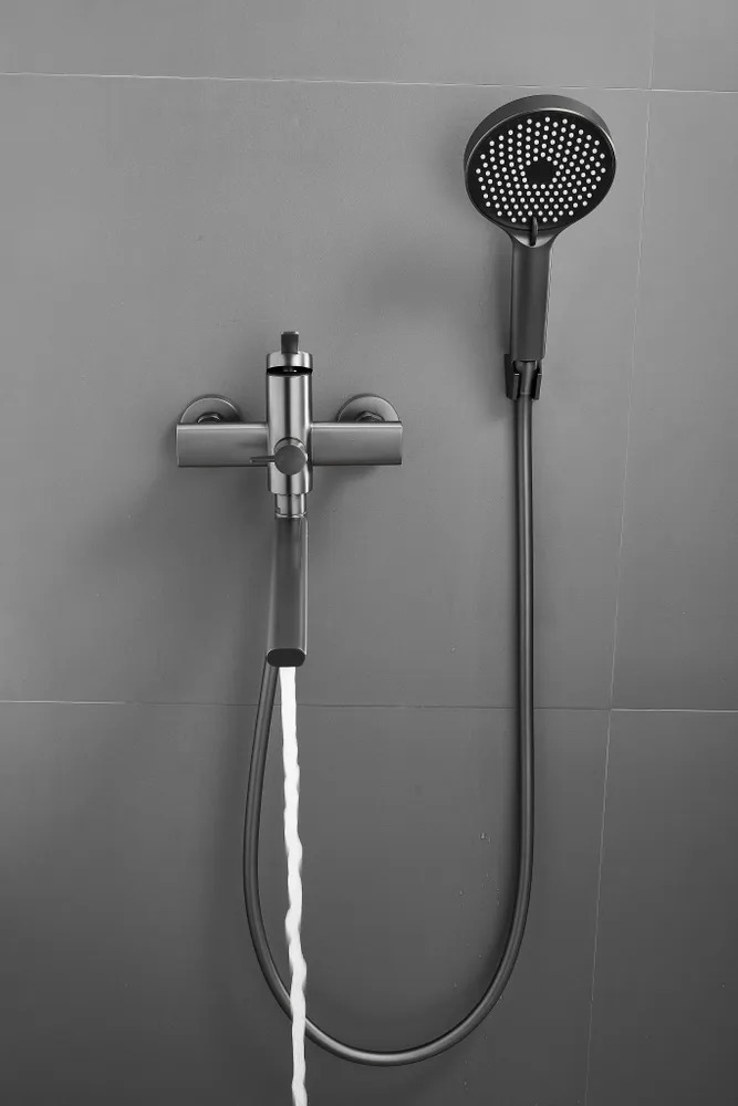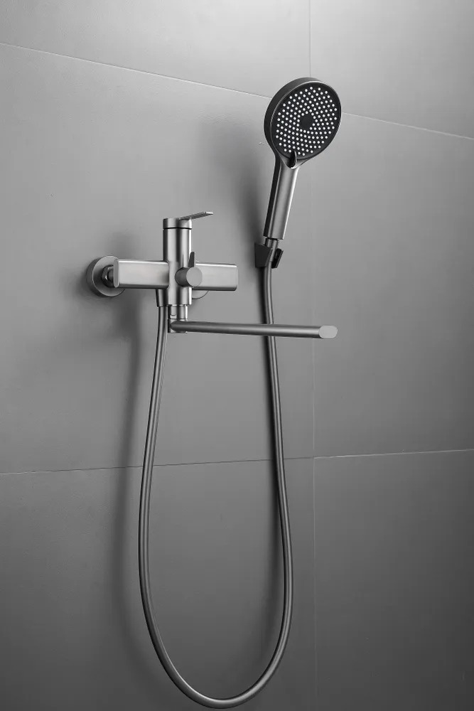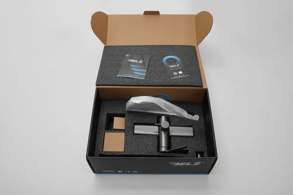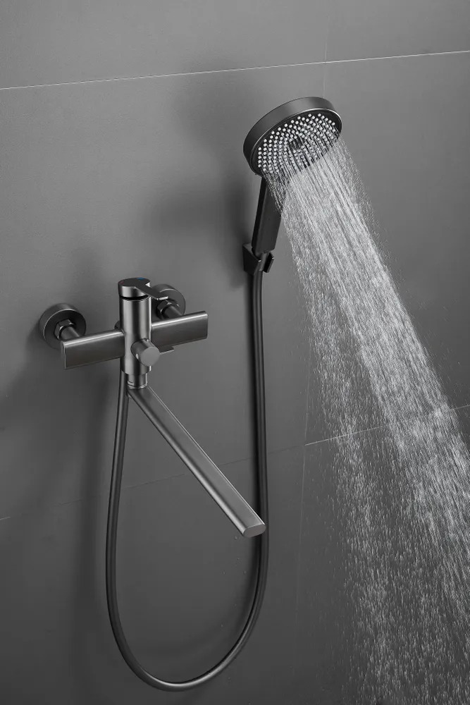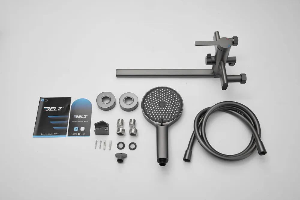 Смеситель для ванны Belz B22813-3 с длинным изливом и душевым гарнитуром, материал латунь, цвет оружейная сталь.