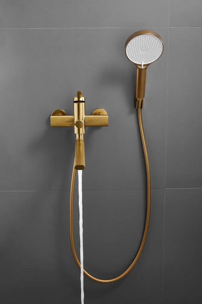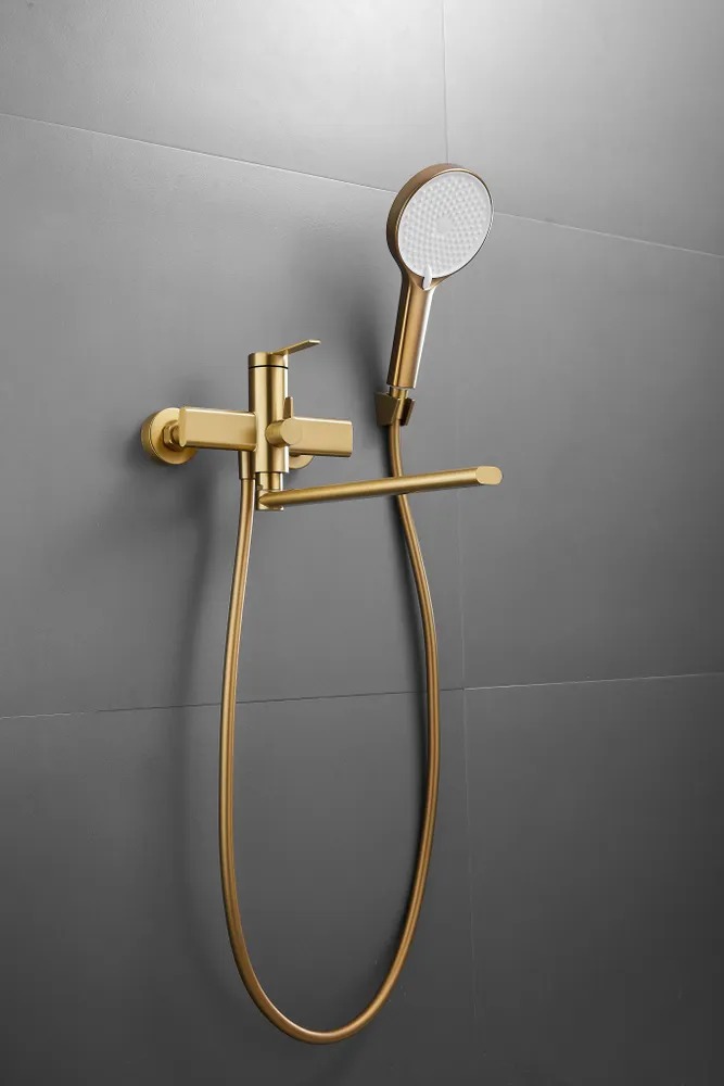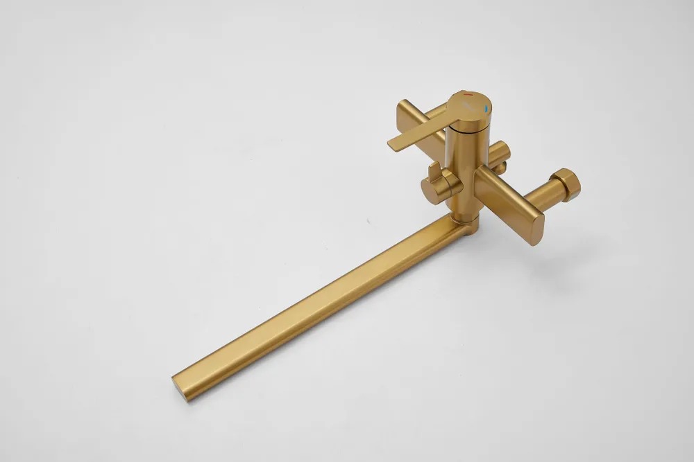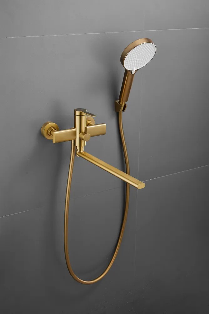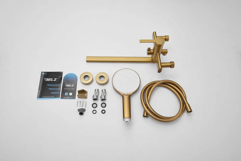 Смеситель для ванны Belz B22813-5 с длинным изливом и душевым гарнитуром, материал латунь, цвет золото.