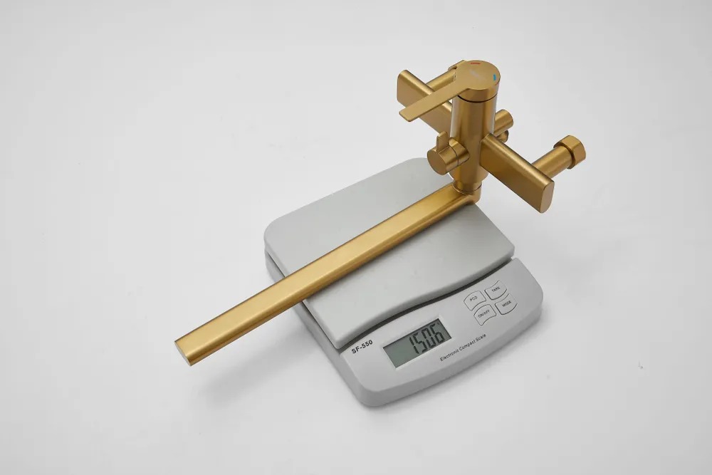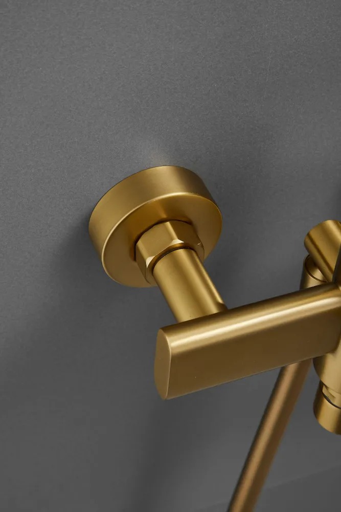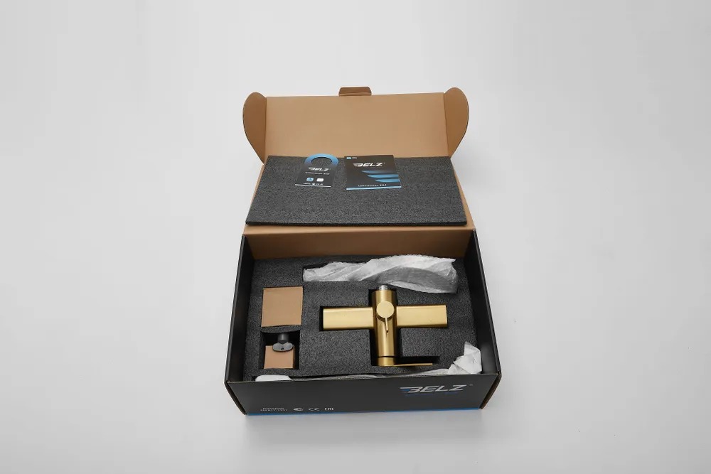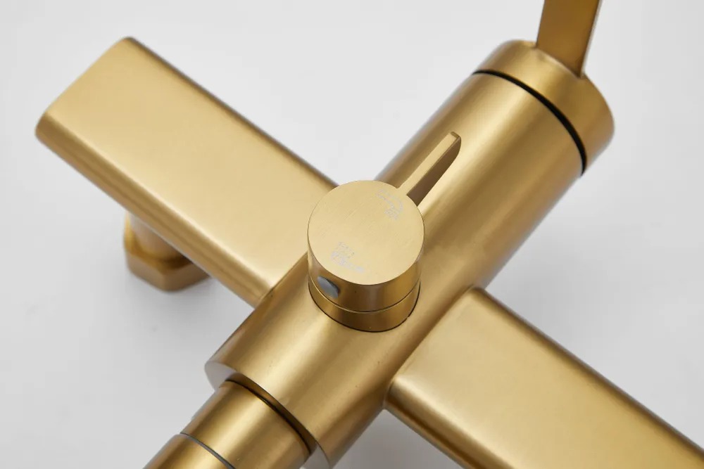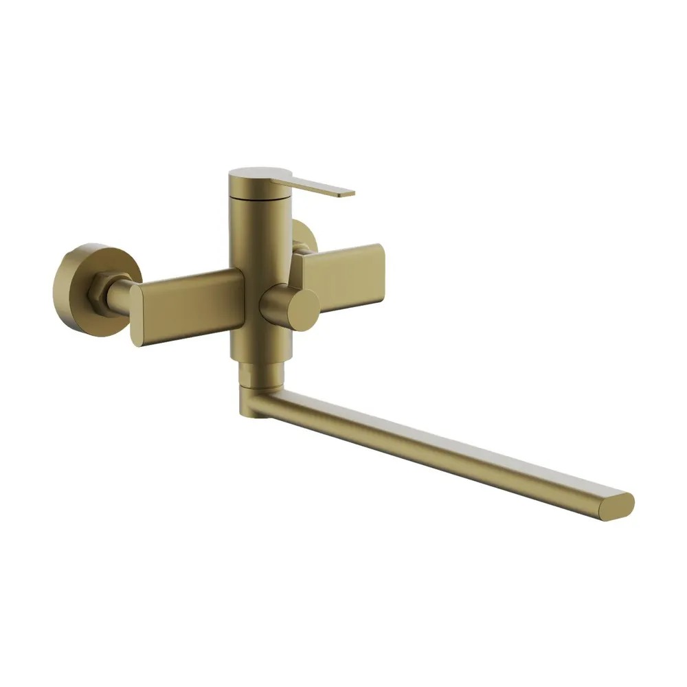 Смеситель для ванны Belz B22813-5 с длинным изливом и душевым гарнитуром, материал латунь, цвет золото.