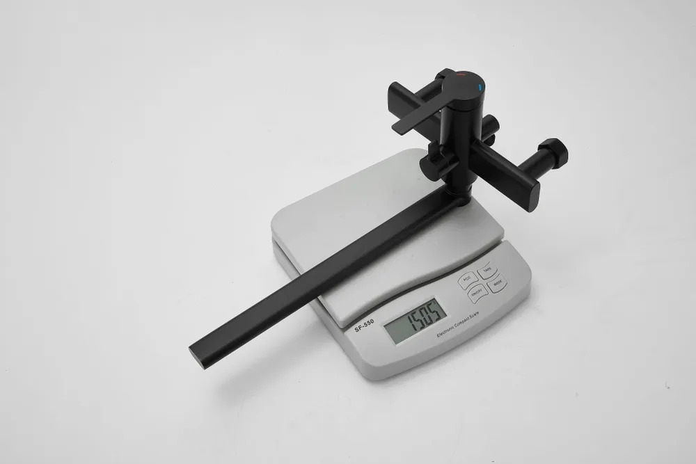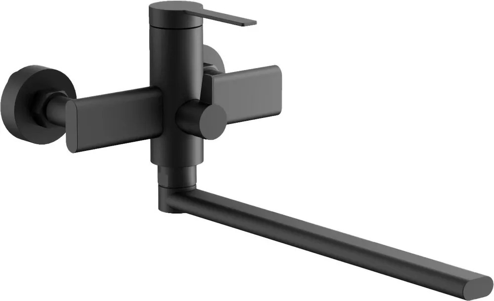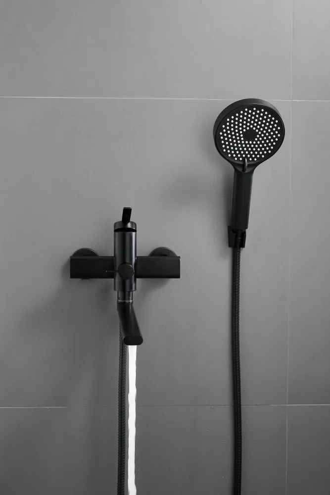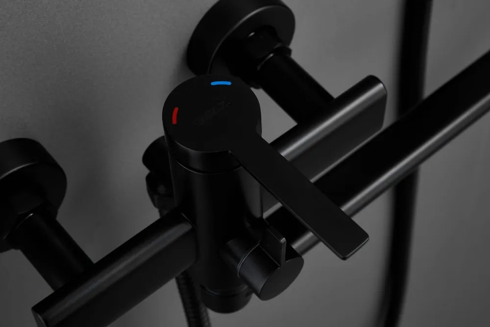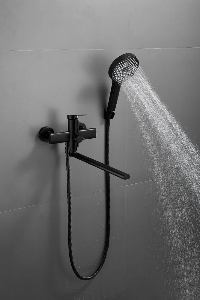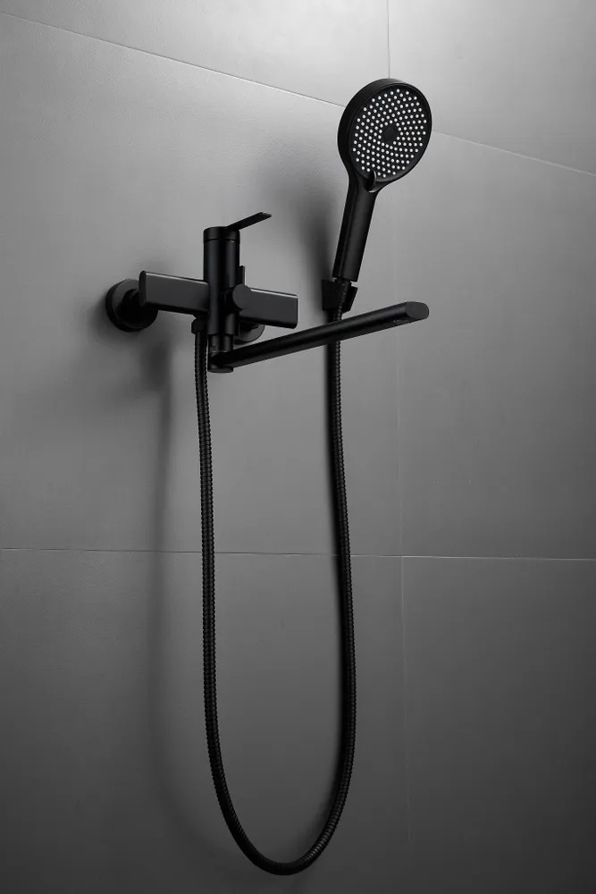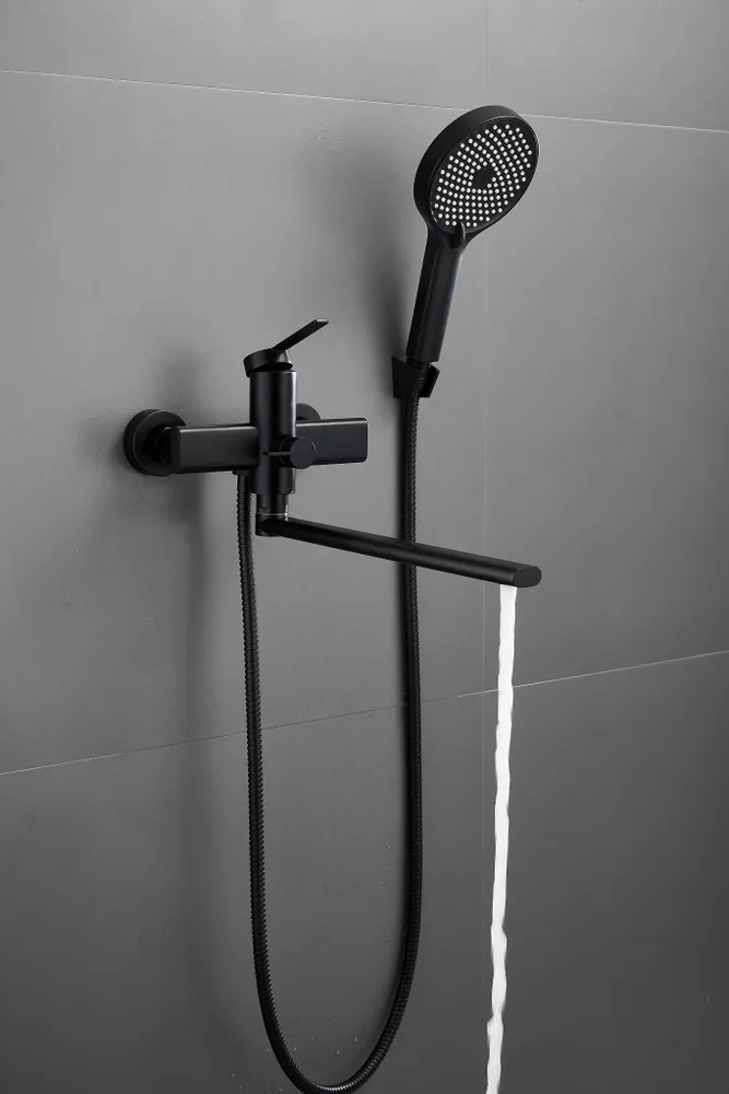 Смеситель для ванны Belz B22813-7 с длинным изливом и душевым гарнитуром, материал латунь, цвет чёрный.