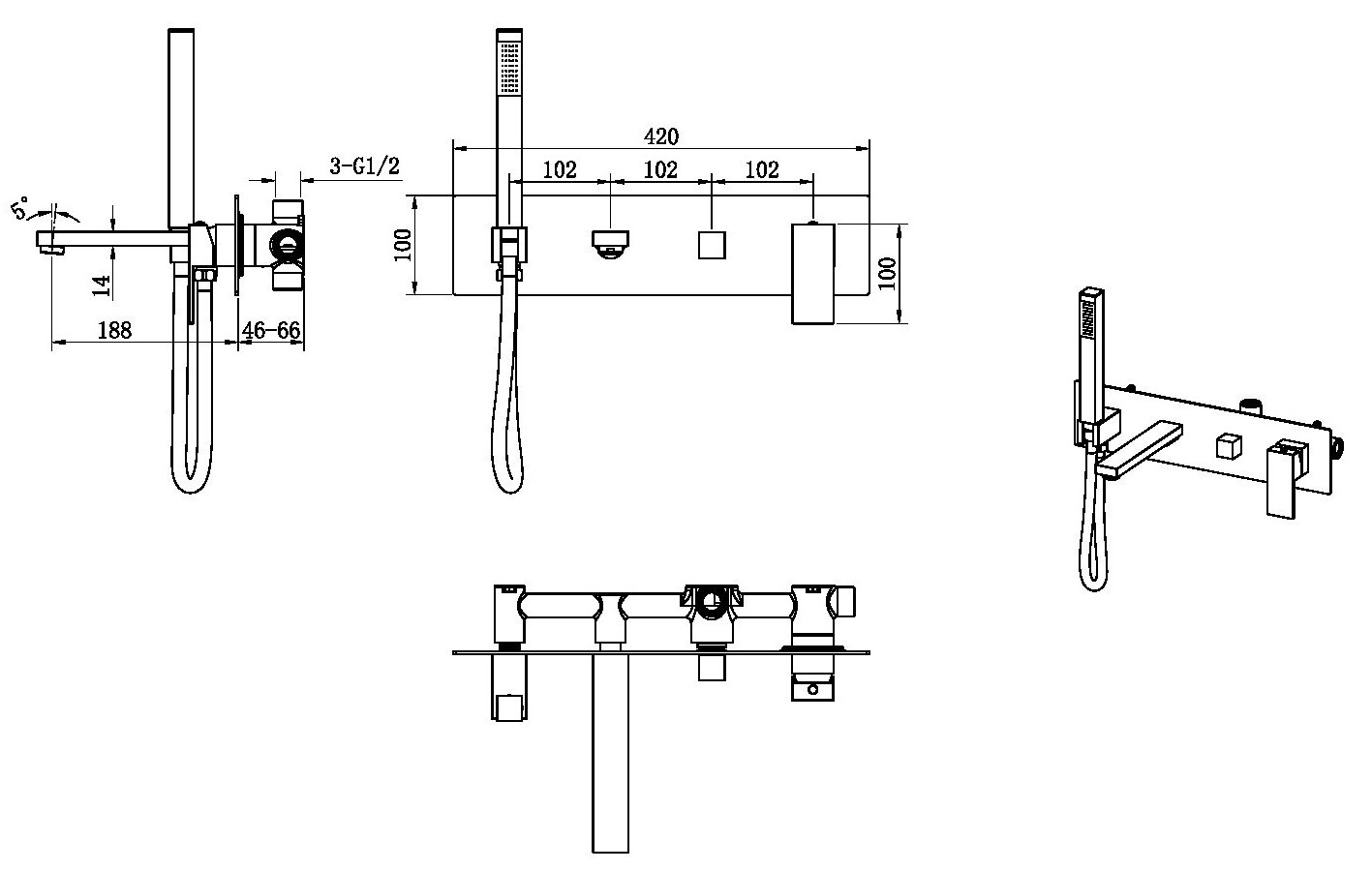 Смеситель для ванны Boheme Qubic 474-2-CB (со скрытой частью) брашированная медь