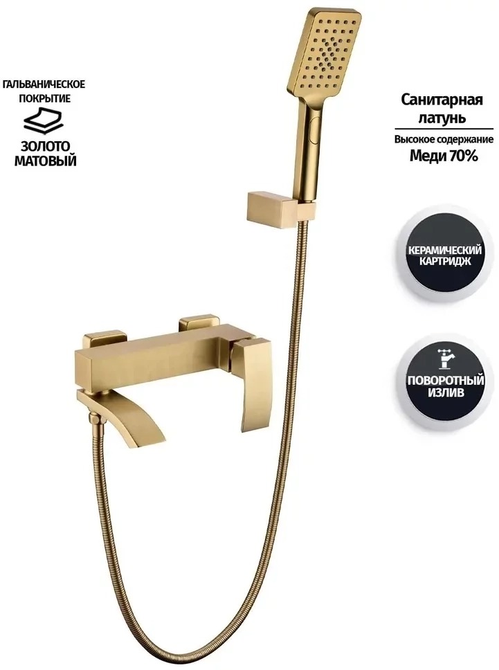 Смеситель для ванны Grocenberg GB8007MG с душевым гарнитуром, материал латунь, цвет матовое золото.