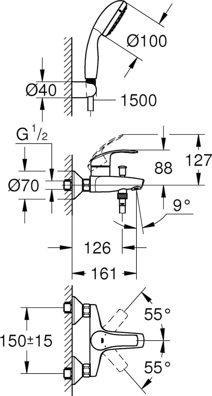 Смеситель для ванны Grohe Eurosmart New 3330220A с душевым гарнитуром, материал - латунь, цвет - хром.
