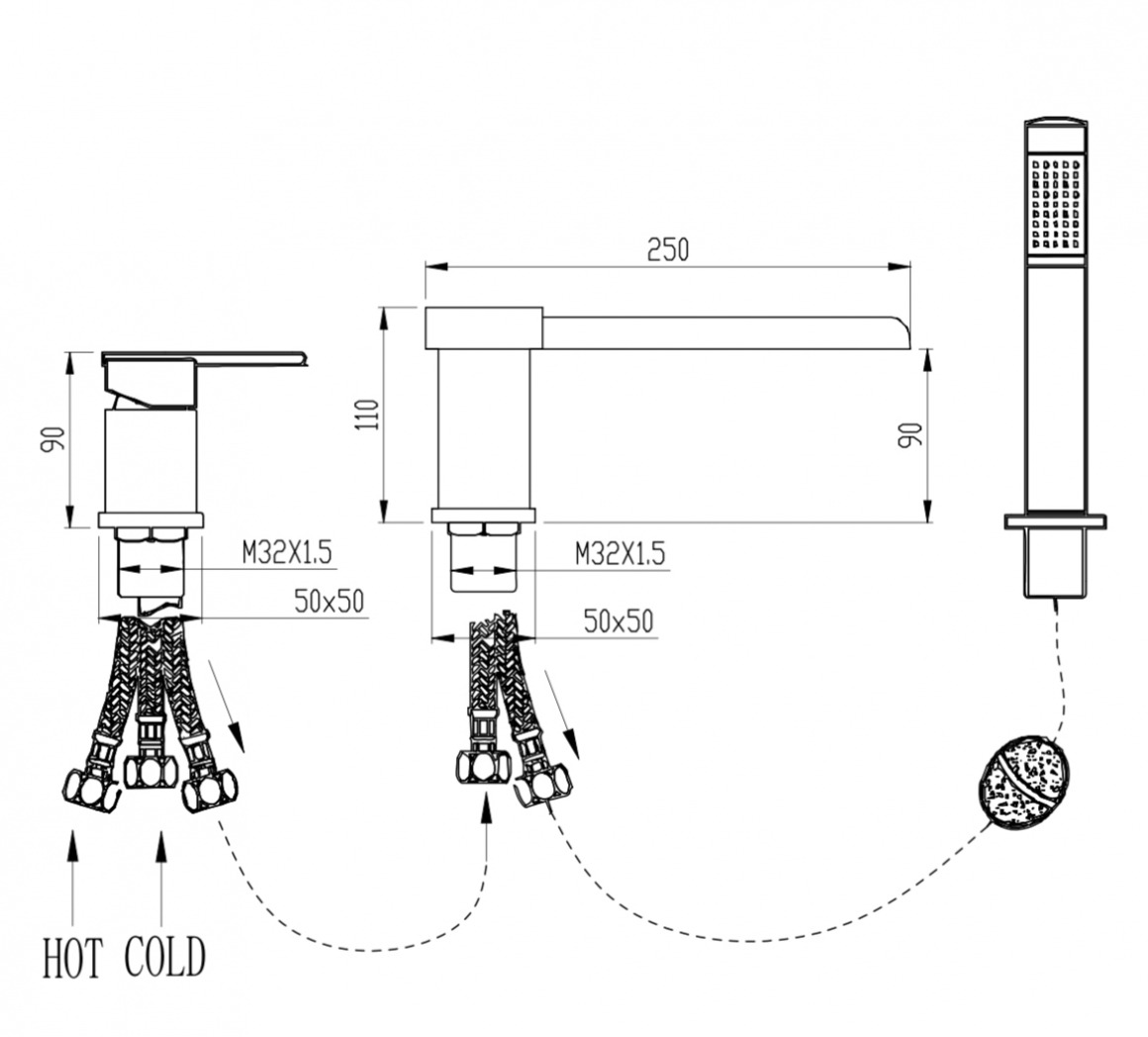 Смеситель для ванны Groсenberg GB6008-2CR, с выдвижным душем, на три отверстия, материал латунь, цвет хром.