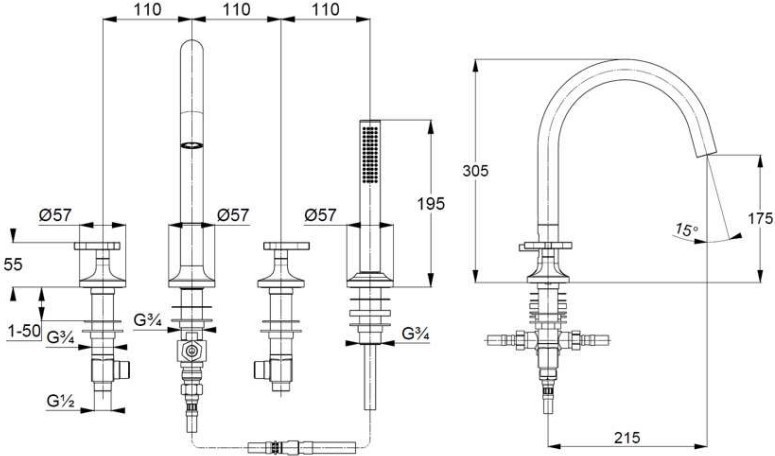 Смеситель для ванны Kludi Nova Fonte Déco 204250539, на 4 отверстия, материал - латунь, цвет - хром.