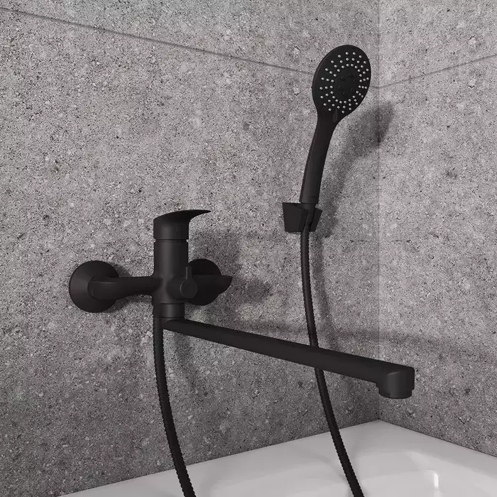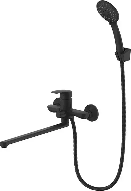 Смеситель для ванны Milardo Rora RORBL00M10 с длинным изливом и душевым гарнитуром, материал - латунь, цвет - чёрный матовый.
