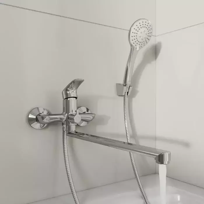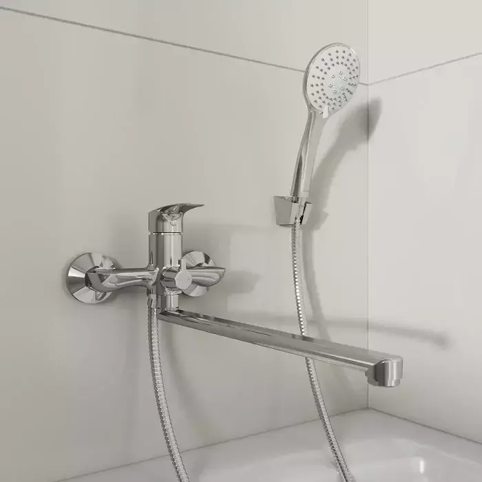 Смеситель для ванны Rora отличается универсальным характером: основной акцент в его дизайне приходится на плавные линии корпуса и классическое цветовое решение. Наличие длинного (35 см) излива позволяет использовать пространство ванны максимально эффективно. Интенсивность и температура потока легко регулируются удобной ручкой смесителя. Поворотный дивертор работает при любом давлении воды, переключая поток воды на большую душевую лейку ( 100 мм) или в комбинированном режиме.