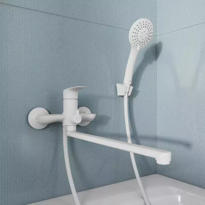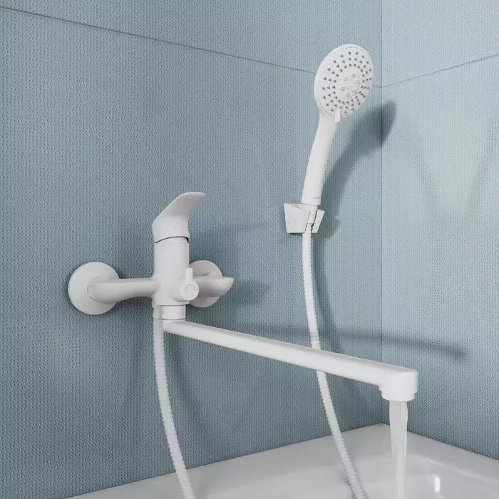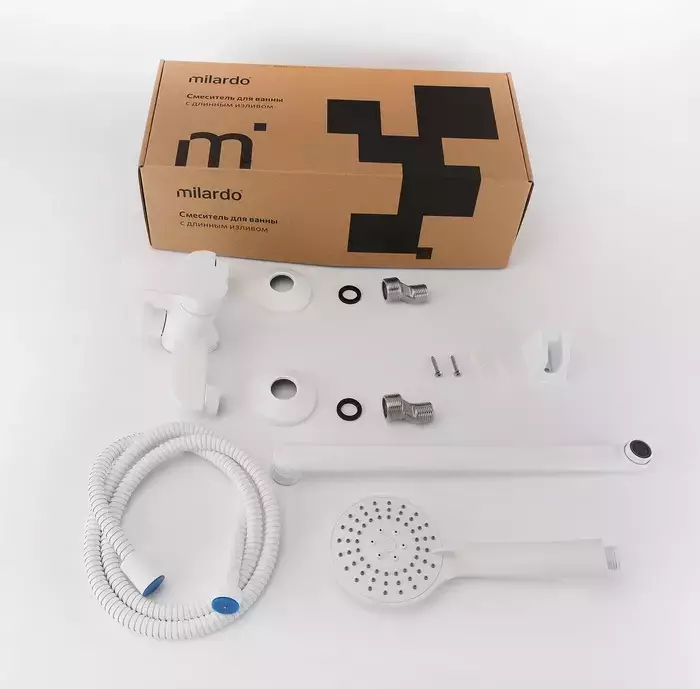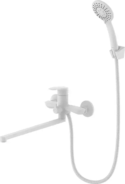 Смеситель для ванны Milardo Rora RORWT00M10 с длинным изливом и душевым гарнитуром, материал - латунь, цвет - матовый белый.