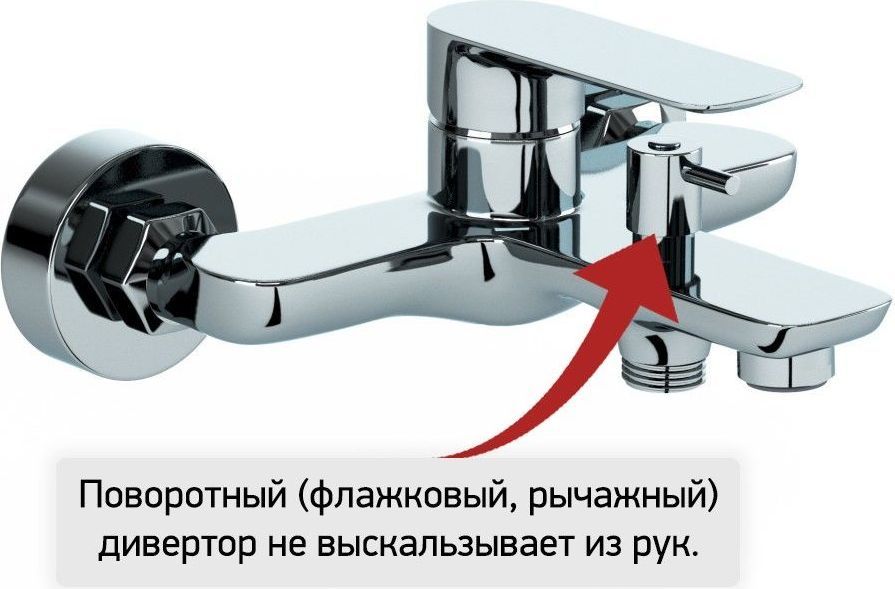 - Поворотный (флажковый, рычажный) дивертор смесителя для ванной PAINI не среагирует на перепад давления воды и внезапно не переключится с душевой лейки на излив.