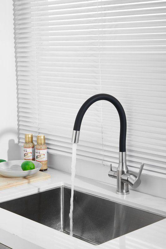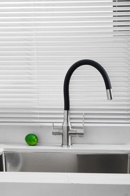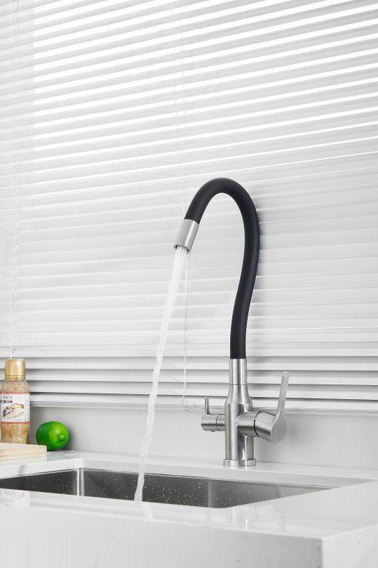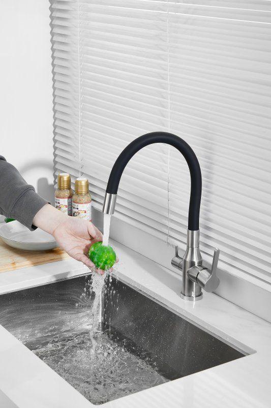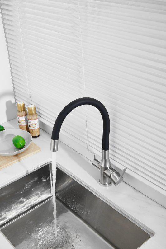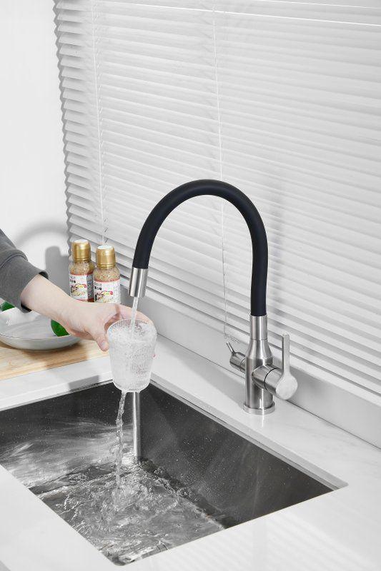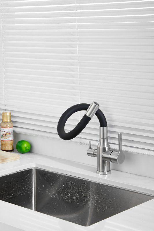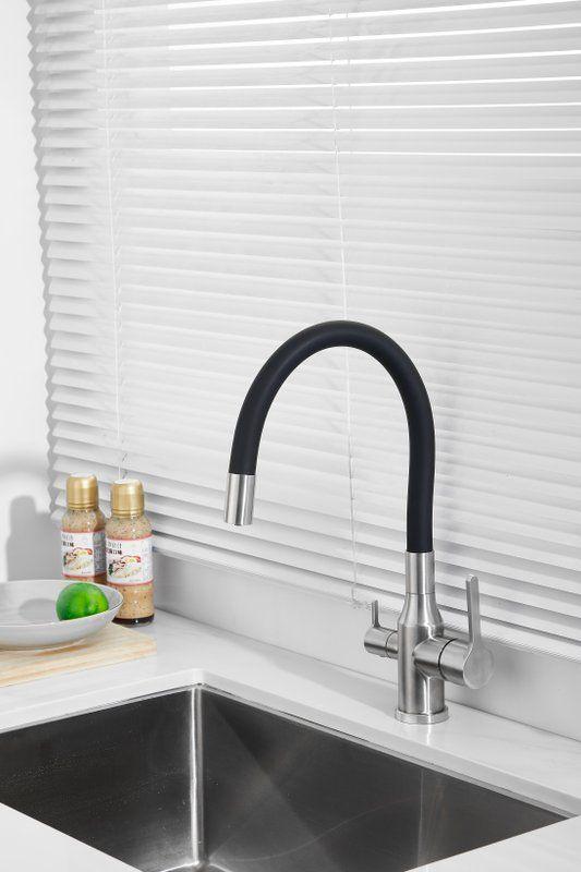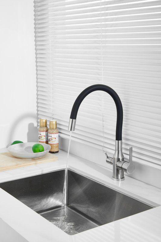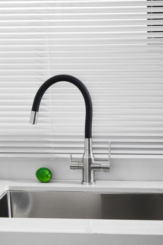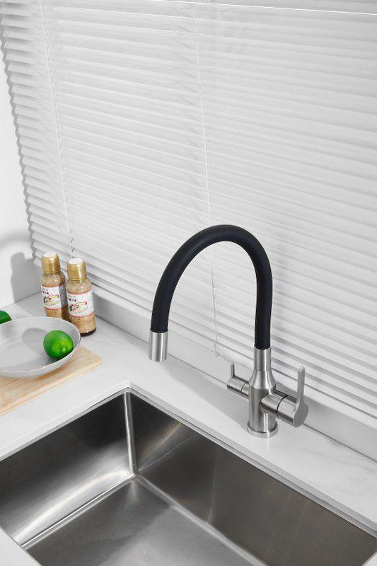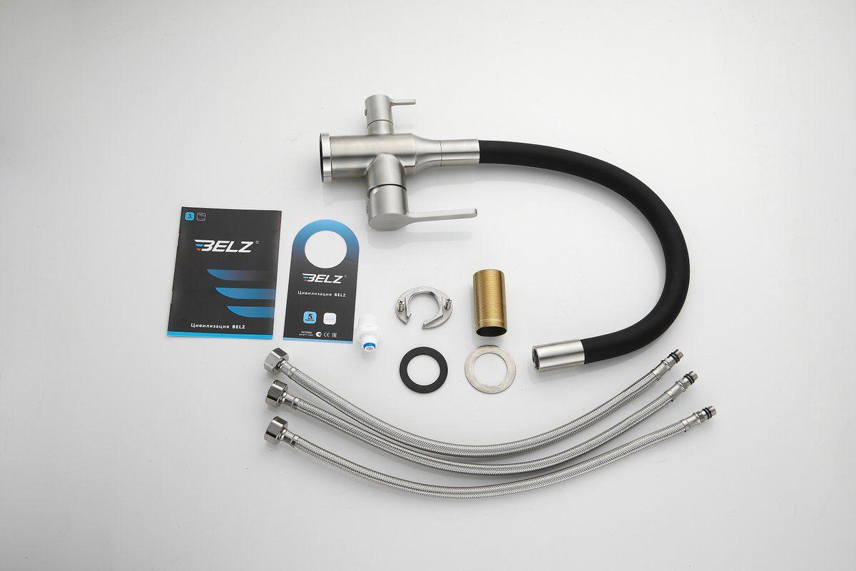 Смесители для кухни Belz B76814-1 с гибким изливом и подключением фильтра, материал нержавеющая сталь/силикон, цвет хром/чёрный.