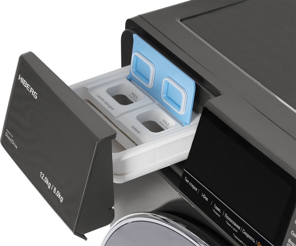 - Отдельностоящая стиральная машина HIBERG i-DDQ6A - 12814 Sd с инверторным мотором и системой прямого привода отстирывает до 12 кг сухого белья за 1 цикл и может высушить максимально 8 кг белья. Модель выполнена в современном дизайне и стильном темно-сером цвете.