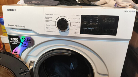 Инверторная стиральная машина NORDFROST i-WQ4 10712 W с функцией сушки имеет прекрасный показатель загрузки белья до 10,5 кг при стирке и до 7 кг при сушке. Инверторный мотор работает тише стандартного, отличается долговечностью и ресурсосбережением, что подтверждено высшим классом энергоэффективности А+++. Машинка потребляет до 64 л воды за цикл стирки с максимальной скоростью отжима 1200 оборотов в минуту.