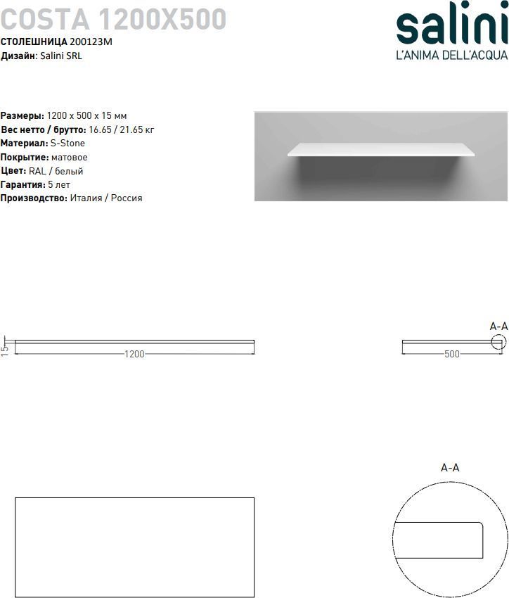 Столешница Salini Costa 120 см, материал искусственный камень, цвет белый. Кронштейн приобретается отдельно.