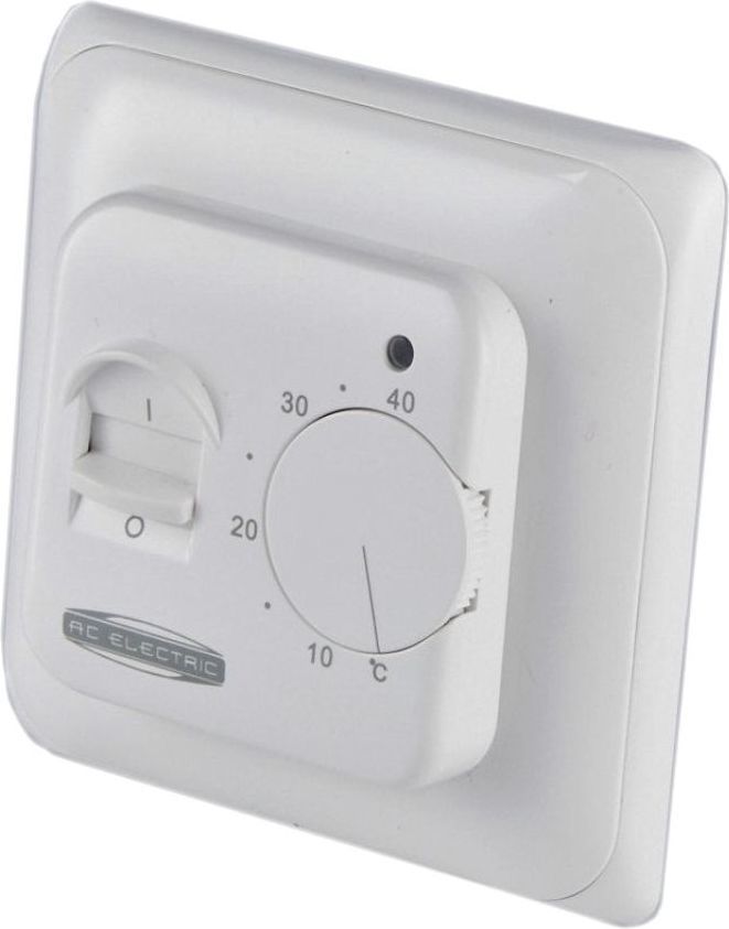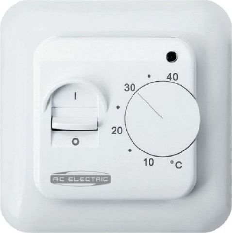AC Electric ACT-16 - надежный терморегулятор, предназначенный для управления электрическим теплым и поддержания заданной температуры. Терморегулятор выполнен в эргономичном дизайне, в белом цвете и способен стать отличным дополнением большинства современных интерьеров. Терморегулятор имеет механическое управление: физическую кнопку включения и колесо регулировки температуры со шкалой, позволяющей устанавливать температуру в диапазоне от 5º С до 40º С, с точностью подержания до 1º С. Благодаря встроенному индикатору можно определить режим работы теплого пола: ожидание I обогрев. Комплект поставки терморегулятора AC Electric ACT-16:• Терморегулятор;• Инструкция с гарантийным талоном;• Болты для крепления к монтажной коробке (подрозетнику);• Датчик температуры пола с соединительным проводом длиной 3м.