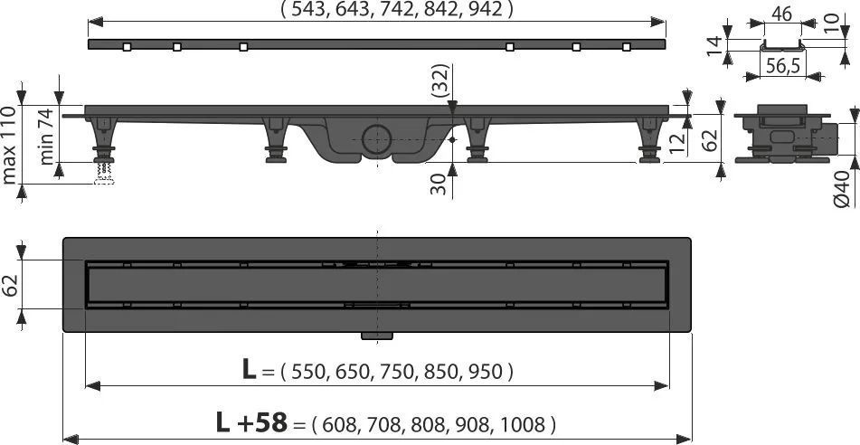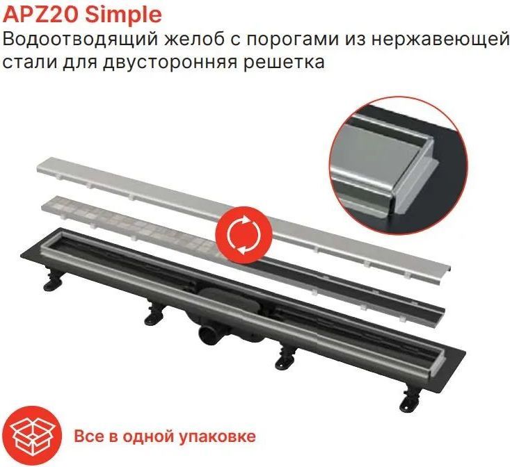 Трап Alcadrain 55 см APZ20-550 с порогами из нержавеющей стали для перфорированной решетки или решетки под кладку плитки.