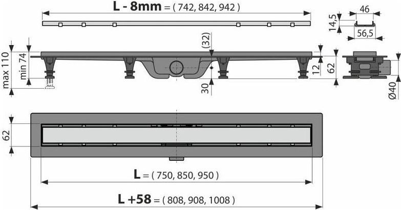 Трап Alcadrain 95 см APZ19-950 с порогами для двусторонней решетки.