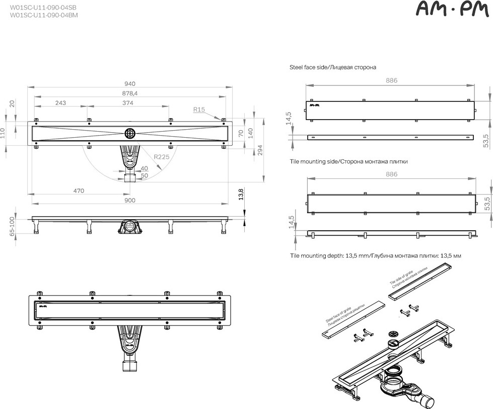 Душевой трап (лоток) 90 AM.PM MasterFlow W01SC-U11-090-04SB комбинированный затвор со стальной матовой решеткой под плитку