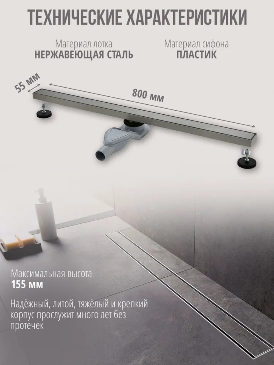 - В комплект входит трап, ножки, сифон, набор для монтажа.