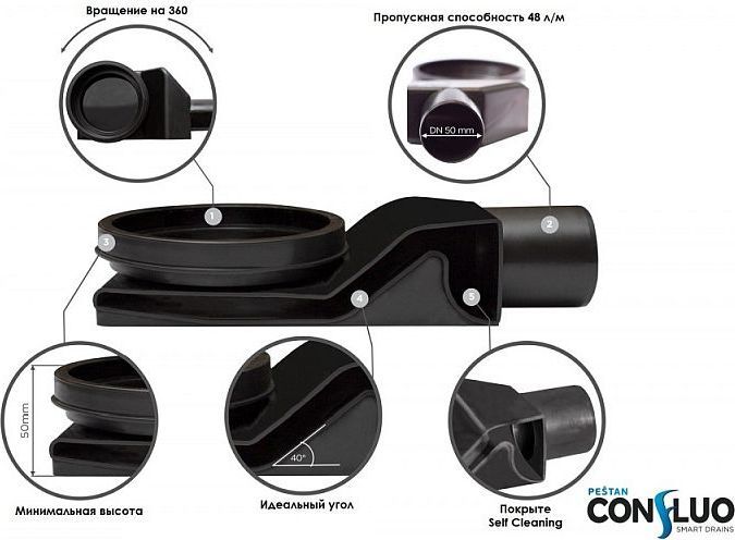 Трап Pestan (BETTOSERB) Confluo Frameless Line Black Glass 75 см 13701205, с двухсторонней вставкой, материал - нержавеющая сталь/закаленное стекло/полипропилен, цвет - хром/черный.