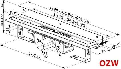 Водоотводящий желоб 750 мм c порогами для решетки и воротником к стене, решетка в комплекте.