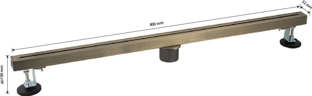 Душевой сливной трап из нержавеющей стали, линейный, вертикальный с сухим затвором, крышка щелевая, цвет бронза. Это специальный элемент сантехнических коммуникаций, предназначенный для отвода воды в систему канализации. Как правило, душевые трапы устанавливаются непосредственно в пол. Благодаря небольшим габаритам и высоте душевые трапы идеальны для установки в душевых зонах. Это важно для организации пространства, где нет возможности установить классическую ванну: в малогабаритных квартирах, студиях, совмещенных санузлах и т.п. Габаритные размеры: ширина 32 мм, длина 800 мм, высота до 100 мм, выход в канализацию 50 мм. Вес - 3,2 кг, объём - 0,007 м3.