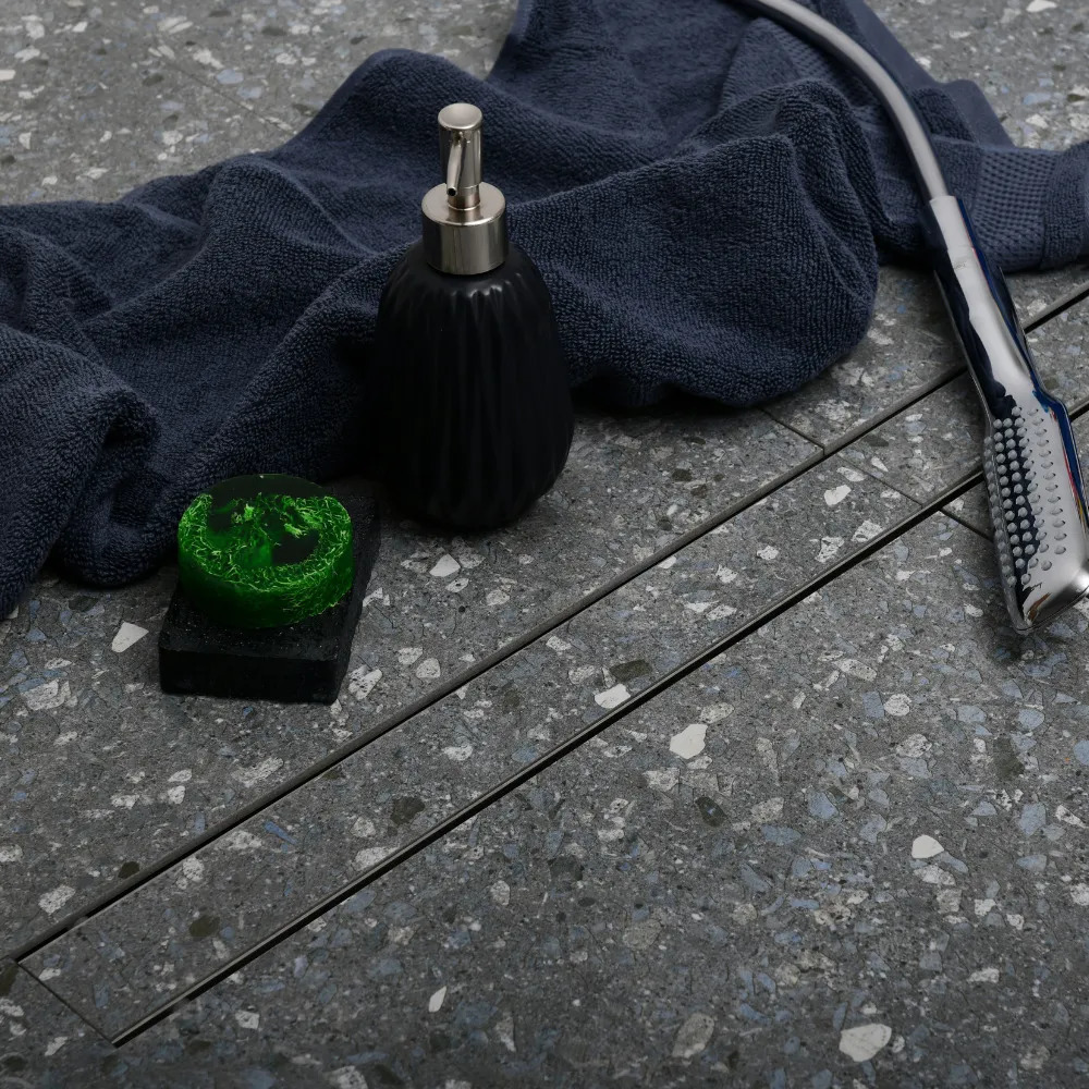 В комплект входит самоклеящаяся гидроизоляционная пленка, сетка для сбора волос, регулируемые ножки, комплект креплений, пластиковый ключ для снятия нержавеющей решетки и инструкция по установке.