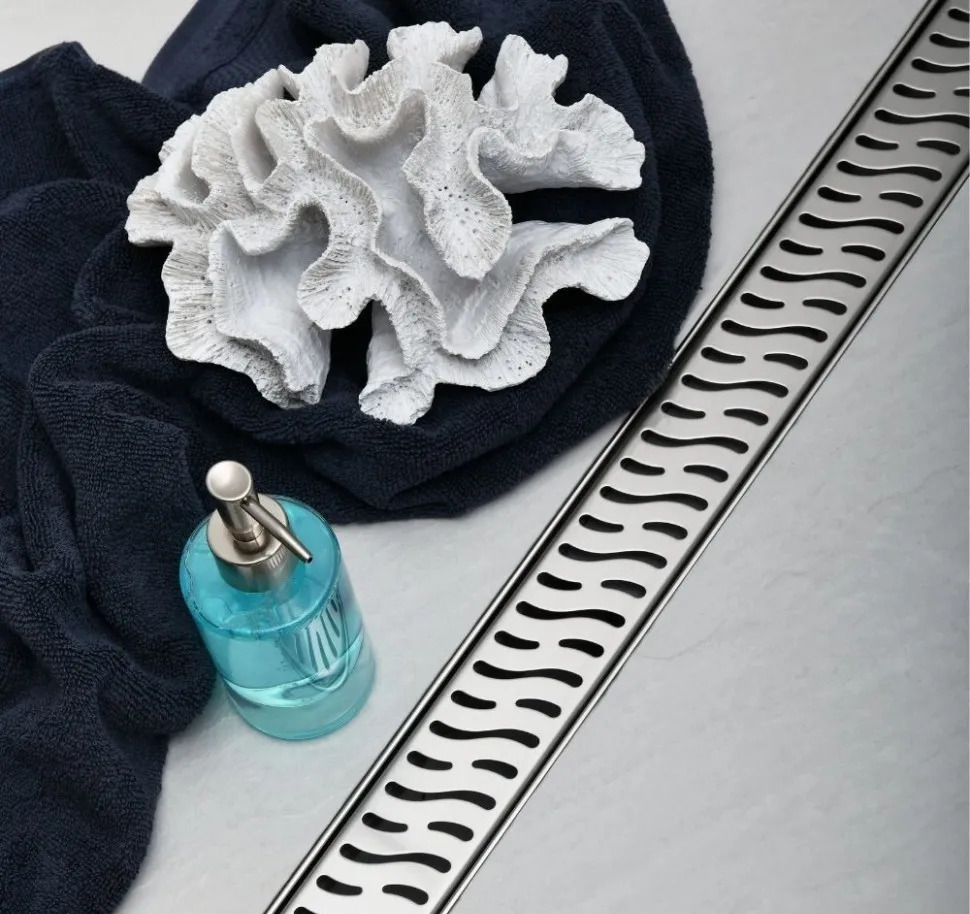 В комплект входит самоклеящаяся гидроизоляционная пленка, сетка для сбора волос, регулируемые ножки, комплект креплений, пластиковый ключ для снятия нержавеющей решетки и инструкция по установке.