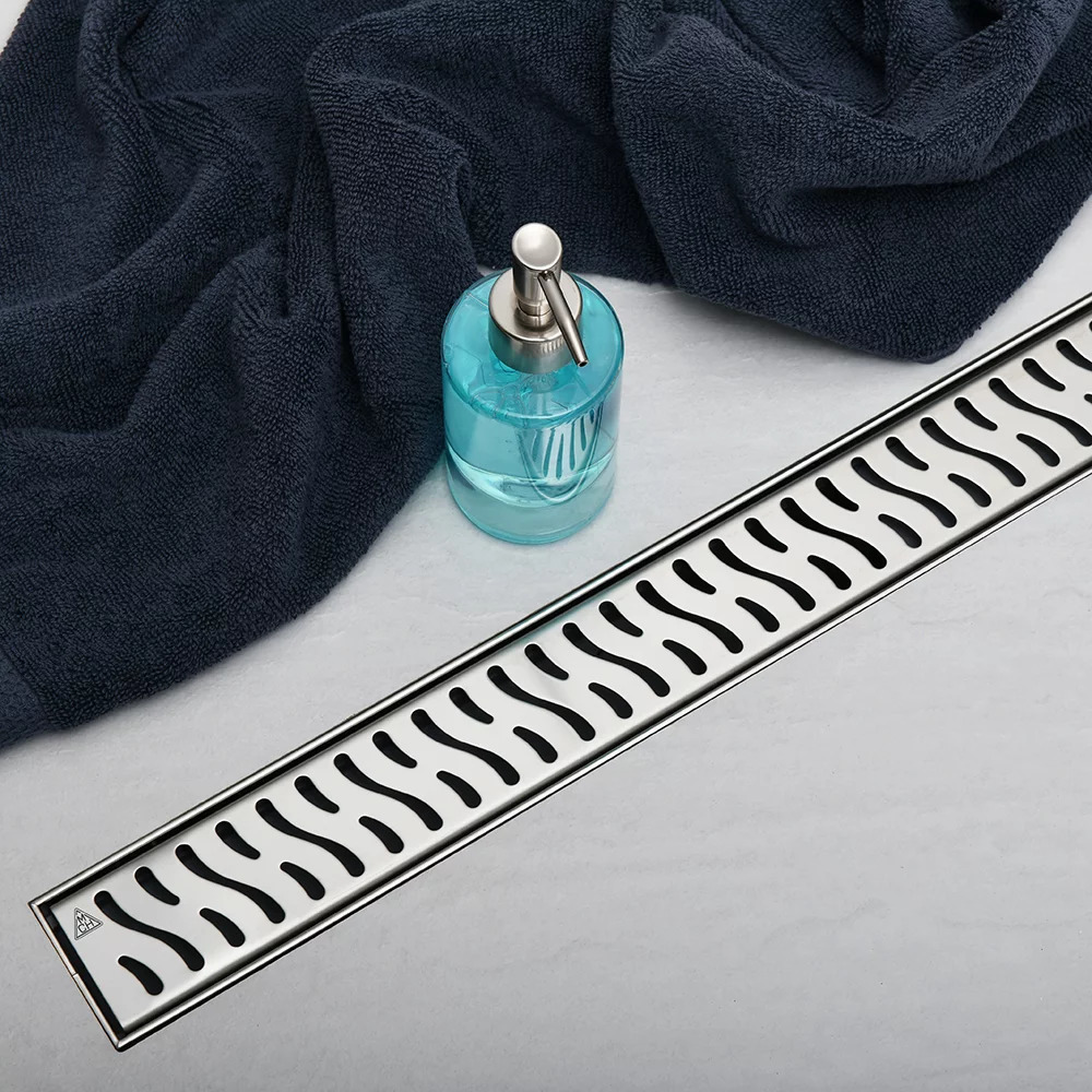 В комплект входит самоклеящаяся гидроизоляционная пленка, сетка для сбора волос, регулируемые ножки, комплект креплений, пластиковый ключ для снятия нержавеющей решетки и инструкция по установке.