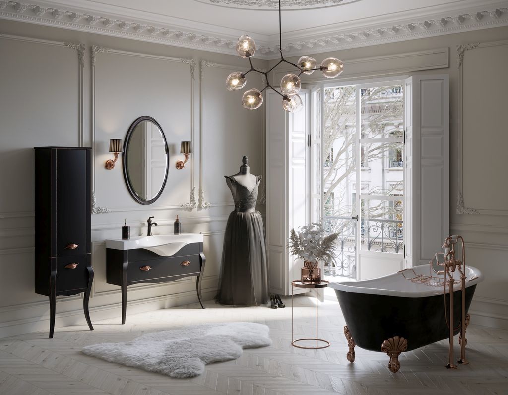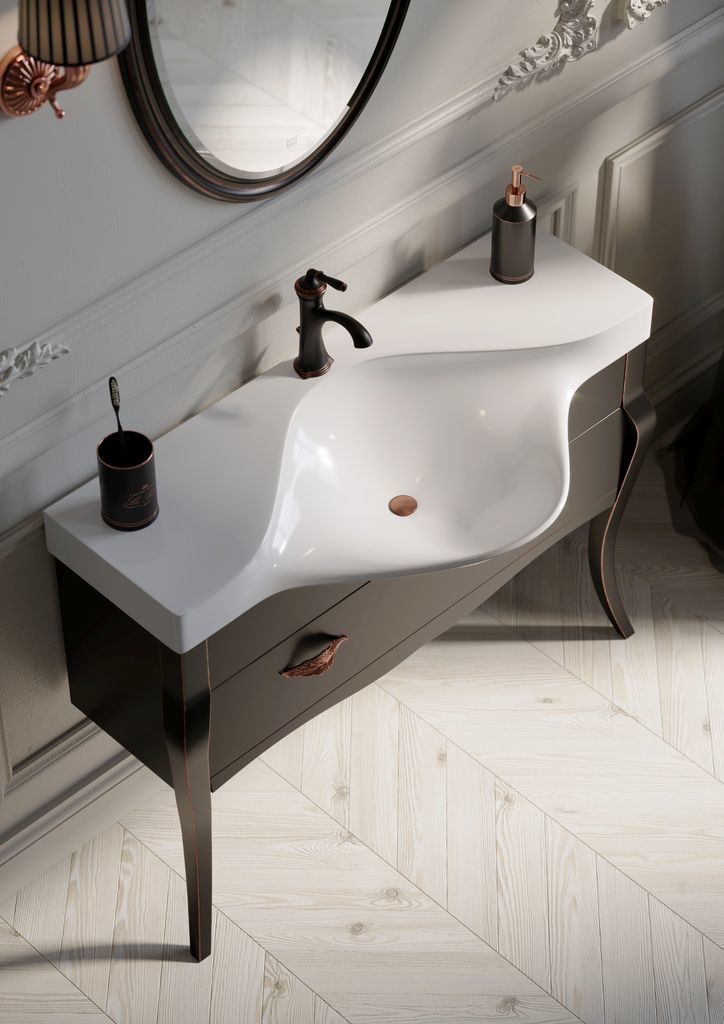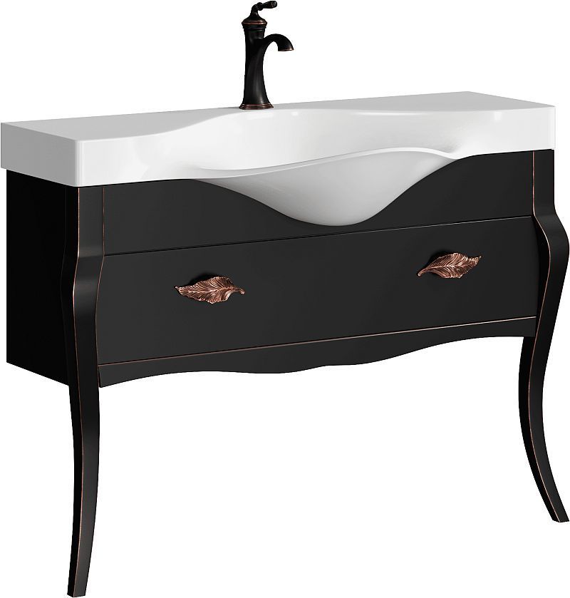 Тумба напольная Clarberg Borgia 110 см с раковиной Brodway 110 см, с 1 ящиком, оснащенными скрытыми направляющими австрийской фирмы Blum с системой мягкого закрывания, цвет черный матовый/патина медь.