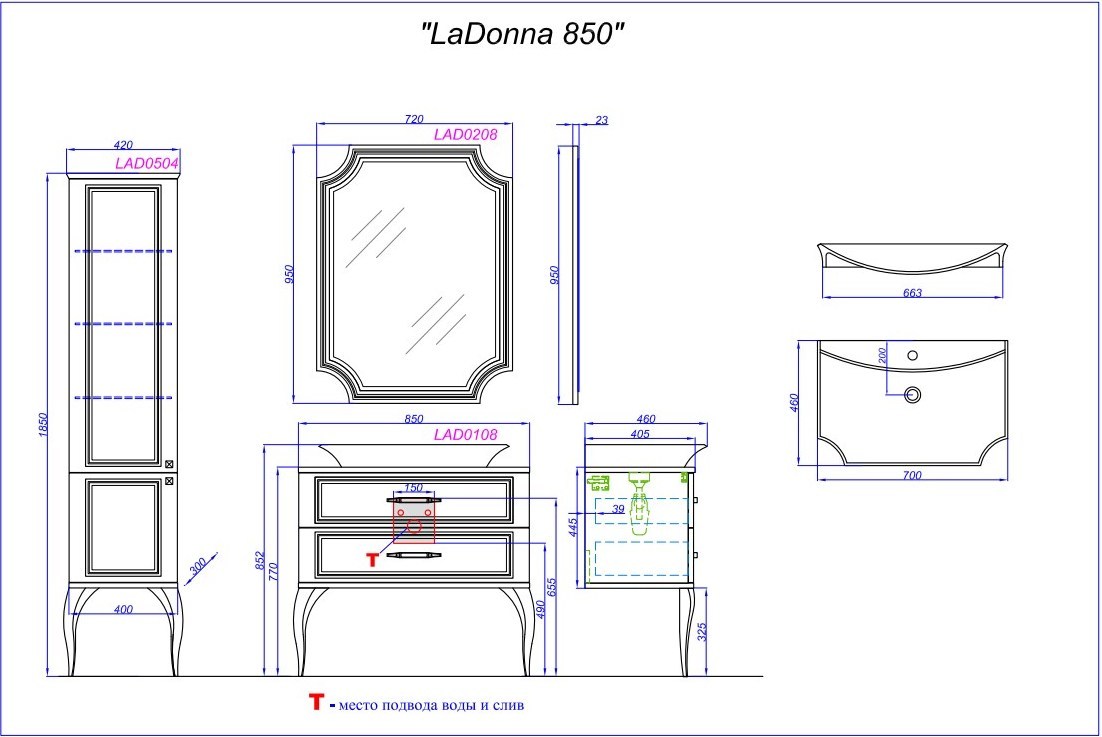 - Напольная тумба размером 85 см комплектуется умывальником La Donna (материал литьевой мрамор, производство Польша) и хромированными ручками.