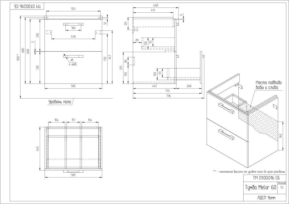 Тумба подвесная/напольная Cersanit Melar 60 с раковиной Como 60, цвет белый. Ножки приобретаются отдельно 2 шт. или 4 шт.