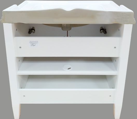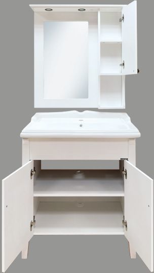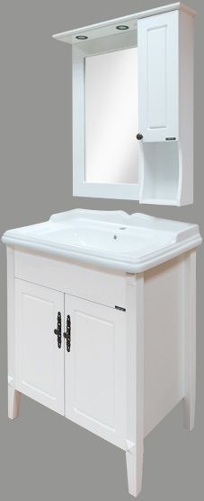 Тумба с двумя створками оснащенными петлями с плавным закрыванием. Тумба окрашена белой глянцевой эмалью. Ножки из массива дерева.