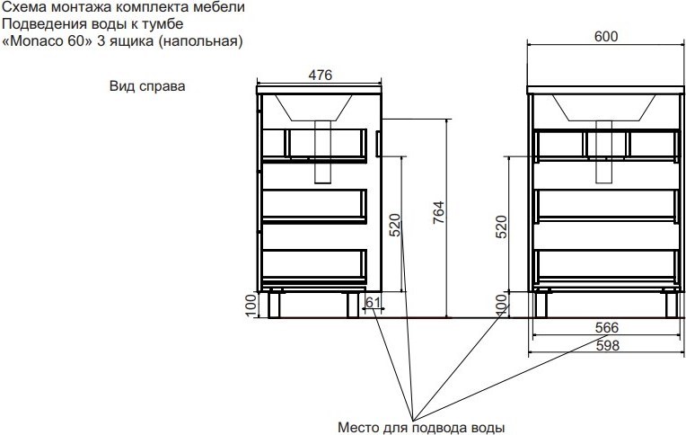 Тумба напольная с раковиной Эстет Monaco 60 см, 3 ящика ФР-00002264