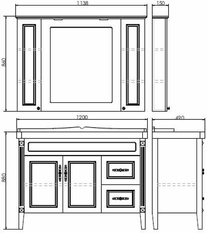 Тумба с двумя створками и двумя ящиками. Петлями створок и направляющие ящиков оснащены механизмами плавного закрывания. Фасады с фрезеровкой, окрашены белой глянцевой эмалью. Ножки из массива дерева. За ствроками одна горизонтальная полка.