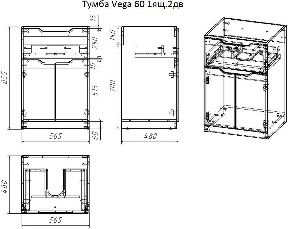 Тумба напольная Dreja Vega 60 см с раковиной-столешницей Wing 120 см, 1 ящик, 2 дверцы, цвет белый глянцевый.