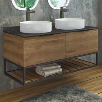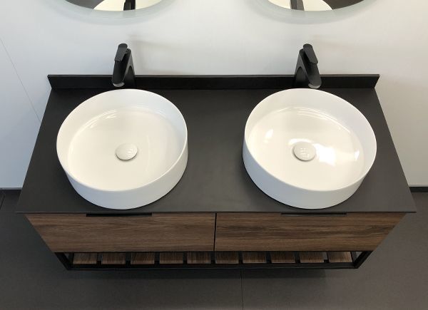 Подвесная тумба-умывальник с двумя выкатными ящиками с плавным закрыванием, столешницей из черного керамогранита и двумя круглыми раковинами-чашами.