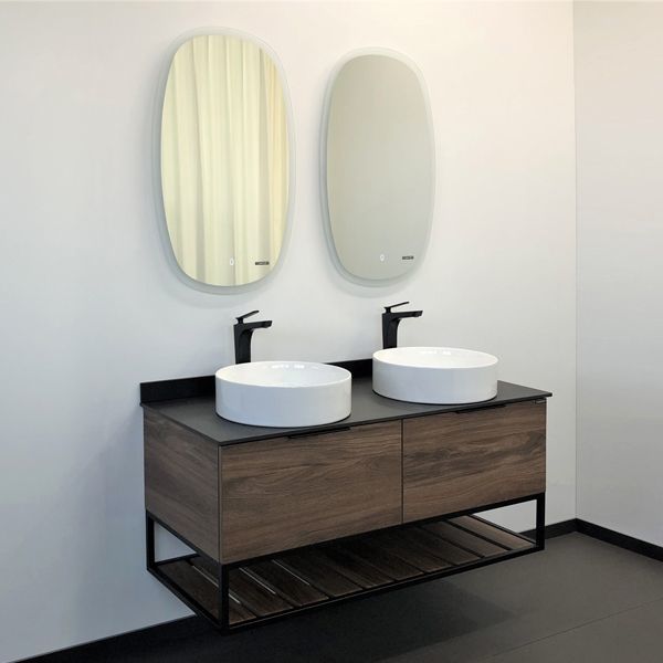 Тумба подвесная Comforty Порто 120 см с двумя раковинами Comforty 9110, столешница и плинтус из черного керамогранита, цвет дуб тёмно-коричневый.