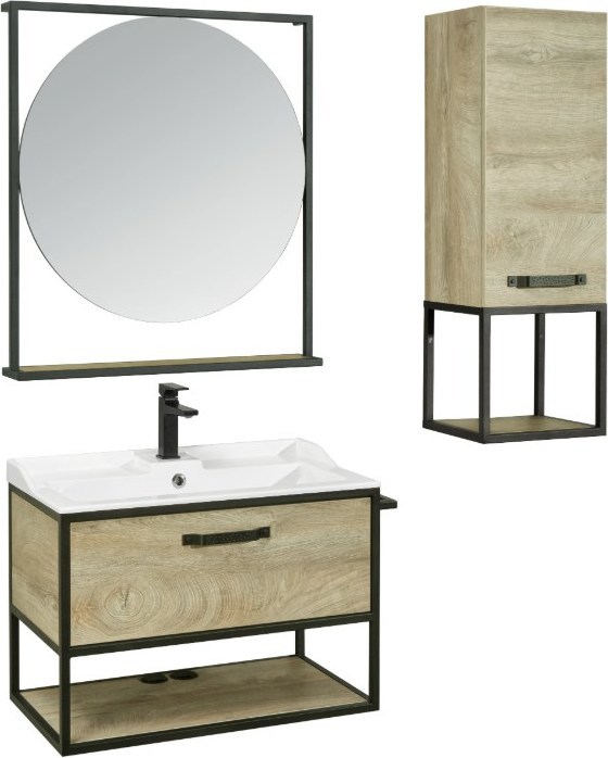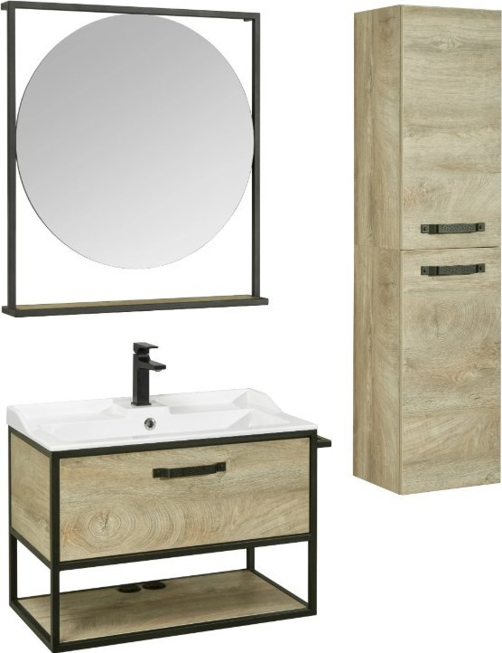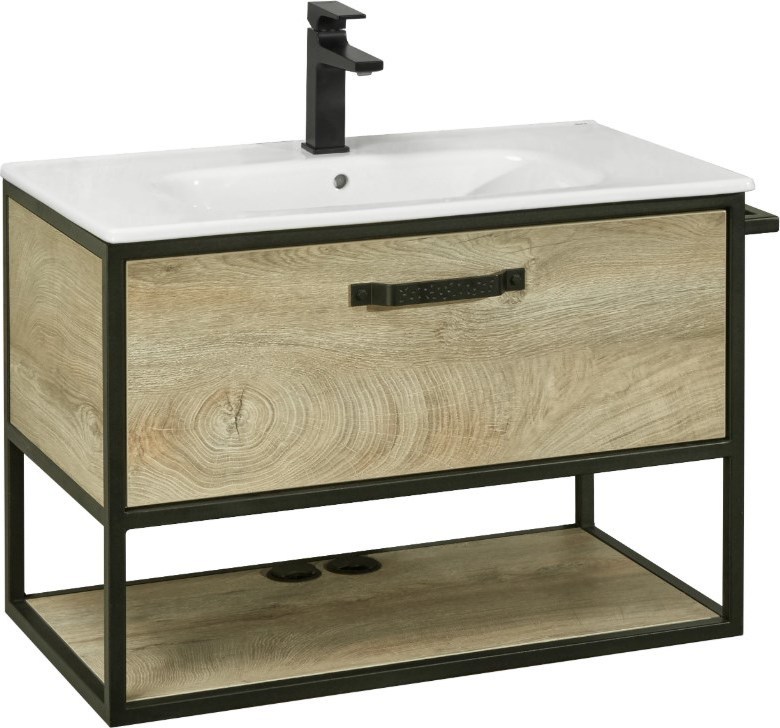Тумба подвесная Акватон Лофт Фабрик 80 см 1A242401LTDU0 с раковиной Фабиа 80 1A708031FB010, цвет мебели - дуб эндгрейн, цвет фурнитуры - черный.