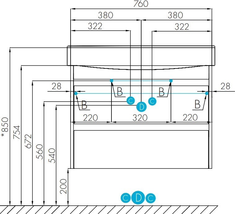 - Тумбу можно использовать в двух вариантах: подвесную или дополнительно приобрести опоры 1A222703SI000