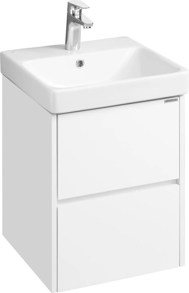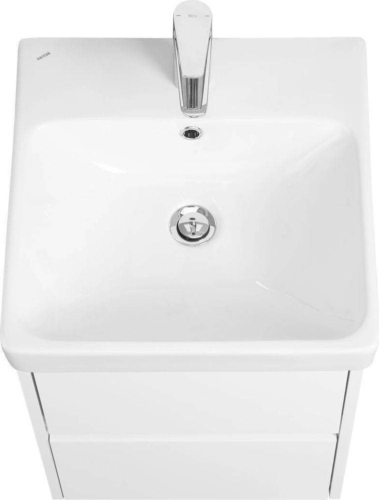 Тумба Сканди 45 выполнена в популярном минималистичном скандинавском стиле. Корпус тумбы выполнен из влагостойкой ЛДСП в белой матовой покраске, а фасады в белой глянцевой покраске. Конструктивно тумба состоит из 2 вместительных ящиков, установленных на направляющие с интегрированной системой push-to-open для комфортного использования. На тумбе нет выступающих деталей и фурнитуры, открытие ящиков реализовано нажатием на фасад. Тумба комплектуется белоснежной раковиной Адриана от бренда Santek.