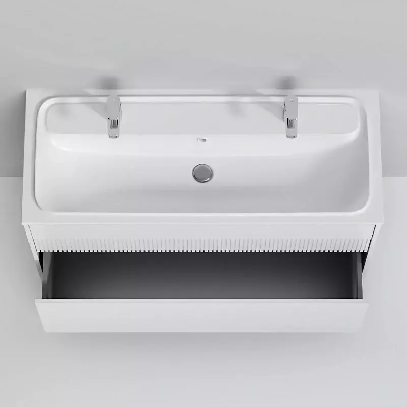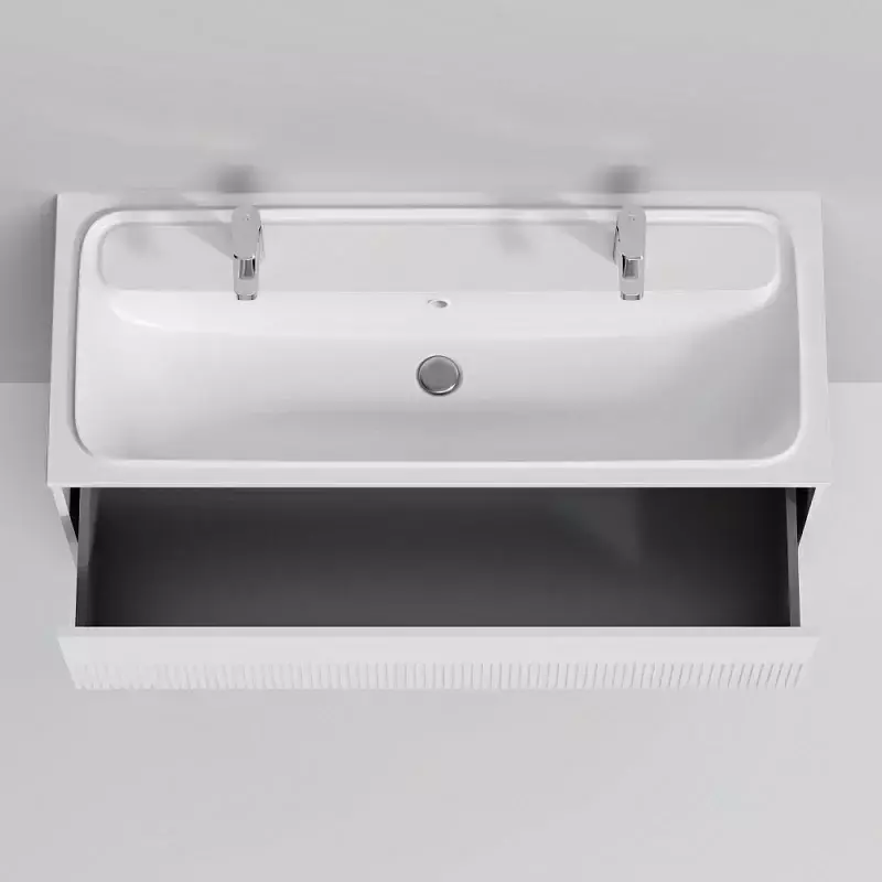 Дополните покупку тумбы уникальной широкой раковиной, интегрированной со столешницей. Раковина позволяет устанавливать два смесителя. Дизайн разработан немецкой студией Design3. Раковина выполнена из литьевого мрамора. Матовая поверхность раковины придает интерьеру ощущение уюта и комфорта. Размер раковины (Ш/Г/В): 1208x492x160 мм. Цвет раковины - белый.