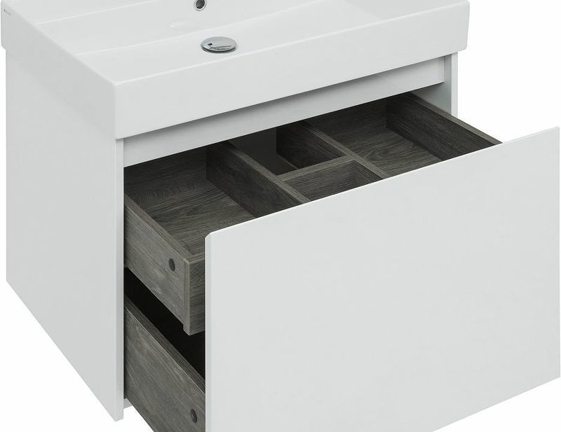 Тумба с раковиной Aquanet Nova Lite 75 белоснежного цвета из влагостойкой ламинированной древесно-стружечной плиты выглядит нарядно. Подвесной монтаж придает визуальную легкость тумбе шириной 75 см. Тумба оборудована одним большим ящиком, внутри которого предусмотрен маленький с выемкой для установки сифона и разделителями, где удобно хранить необходимые в ванной комнате мелочи. Фасады выполнены с декоративной интегрированной ручкой, не имеющей острых краев и внутренних углов, что обеспечивает удобство в эксплуатации и легкий уход за мебелью. Ящики комплектуются направляющими немецкого производства Hettich Quadro, оснащенными доводчиками. Неглубокая и стильная керамическая раковина «Латина» идеально подходит к тумбе.