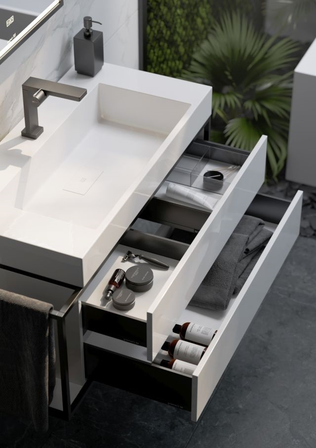 - Тумбы с двумя ящиками, оснащенными системой Tip-on-blumotion от австрийской фирмы Blum