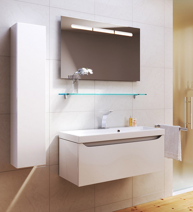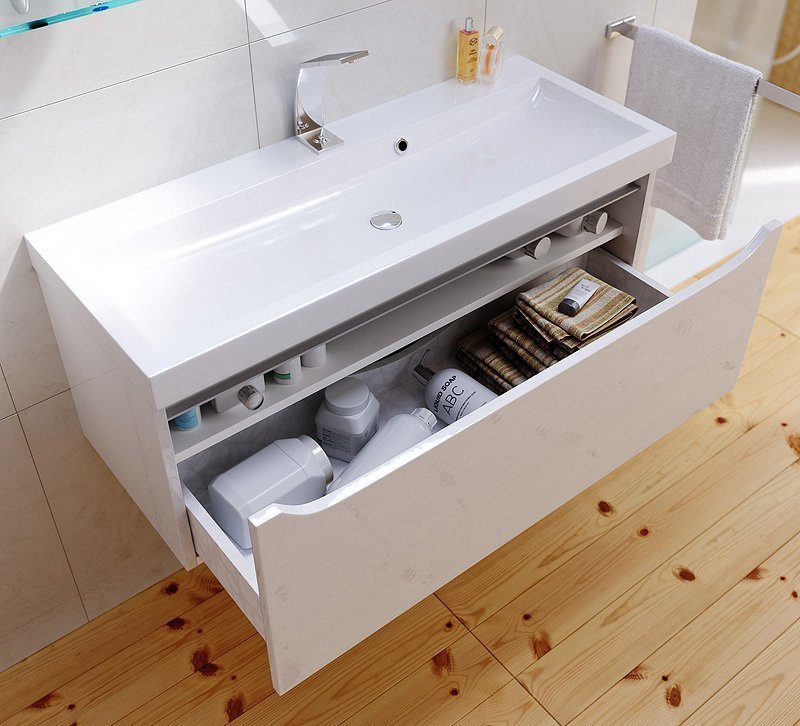 - Модели имеют один ящик, оснащенный системой полного выдвижения и мягкого закрывания фирмы Blum (Австрия) и усиленными навесами фирмы CАMAR (Италия) с ответными планками. Кроме того, модели оборудованы внутренней полкой в которую можно складывать разные мелочи, полотенца.