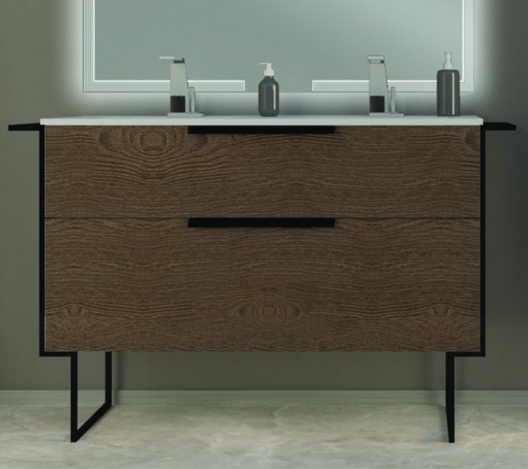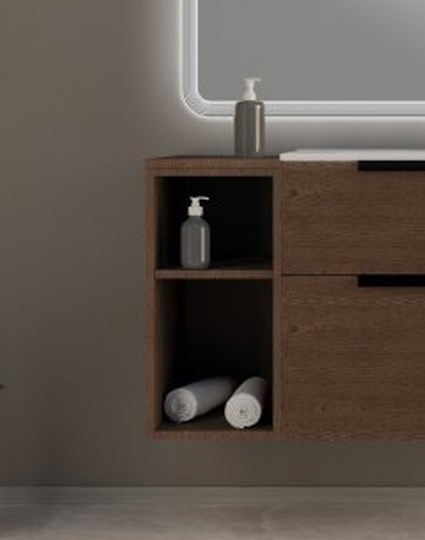 Тумба подвесная Cezares Urban 120 см с раковиной 50135 и подвесным шкафчиком с открытыми полками, оснащена 2 выдвижными ящиками с доводчиками SOFT, цвет мебели - Frassino scuro, цвет металлических ручек - черный матовый, внутренняя часть мебели цвет - антрацит. Ножка приобретается отдельно.