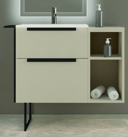 Тумба подвесная Cezares Urban 60 см с раковиной 50202 и подвесным шкафчиком с открытыми полками, оснащена 2 выдвижными ящиками с доводчиками SOFT, цвет мебели - Spatolato bianco, цвет металлических ручек - черный матовый, внутренняя часть мебели цвет - антрацит. Ножка приобретается отдельно.
