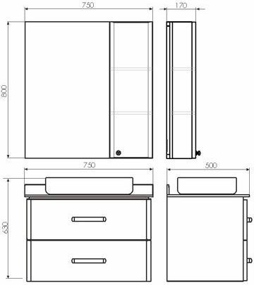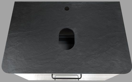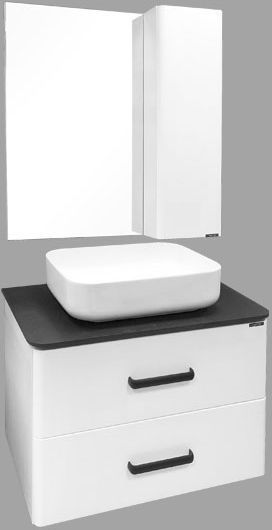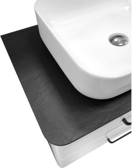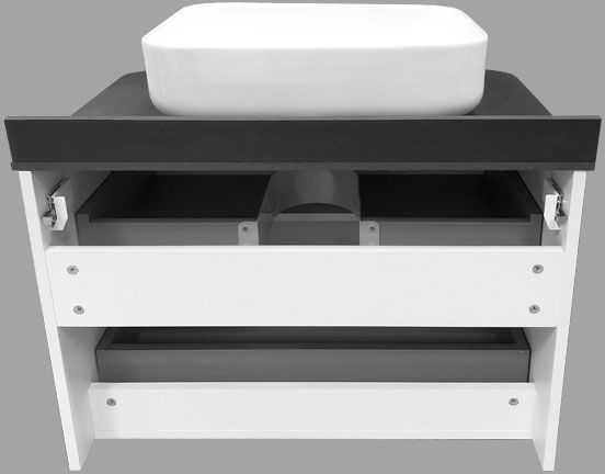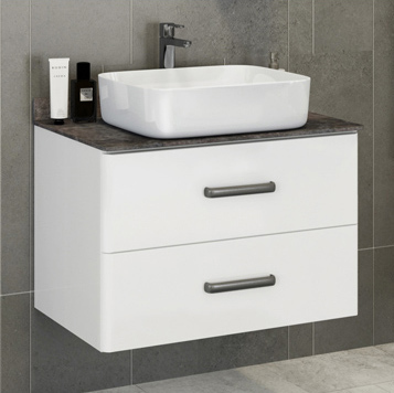 Подвесная тумба с двумя выкатными ящиками оснащенными системой плавного закрывания. Оригинальные эргономичные ручки. Тумба укомплектована столешницей и плинтусом из темно-серого керамогранита и накладной прямоугольной раковиной.