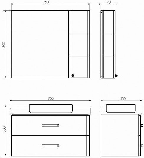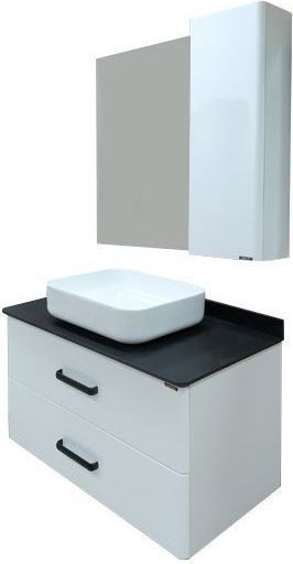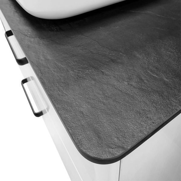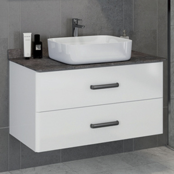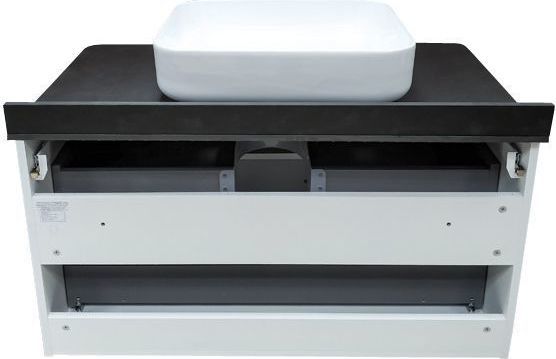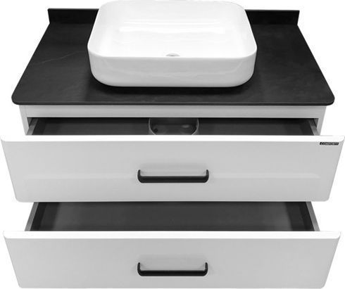 Подвесная тумба с двумя широкими выкатными ящиками оснащенными системой плавного закрывания. Оригинальные эргономичные ручки. Тумба укомплектована столешницей и плинтусом из темно-серого керамогранита и накладной прямоугольной раковиной.