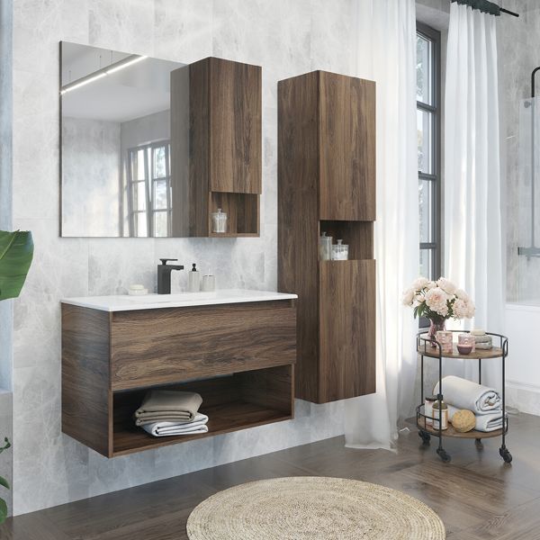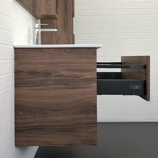 - Подвесная тумба с ящиком оборудованным системой плавного закрывания и пространством для открытого хранения.