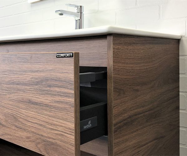 Тумба подвесная Comforty Бордо 90 см с раковиной Quadro 90, цвет дуб тёмно-коричневый.